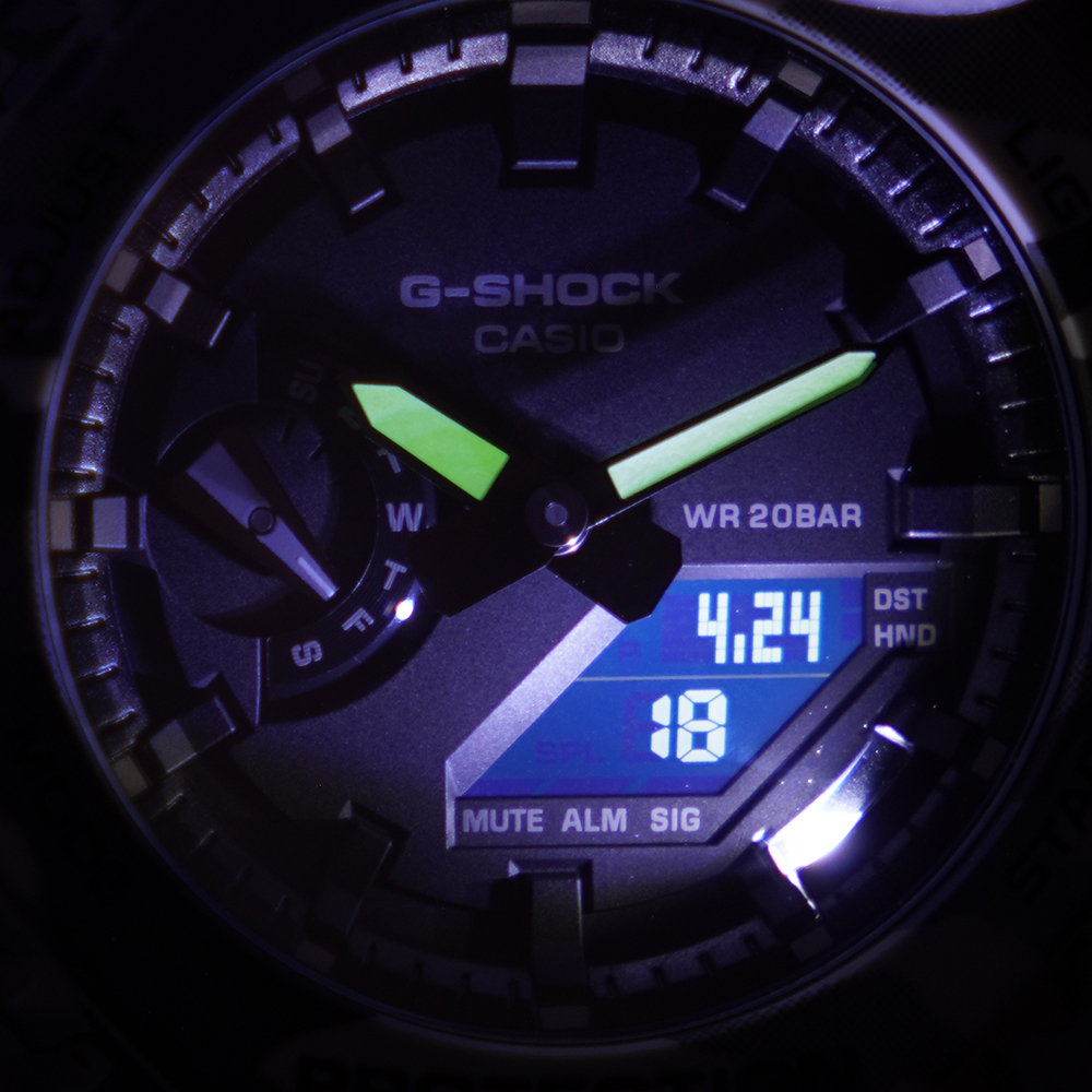 - Podwójny iluminator-Podświetlenie zarówno analogowej jak i cyfrowej tarczy zegarka, kiedy funkcja jest włączona.