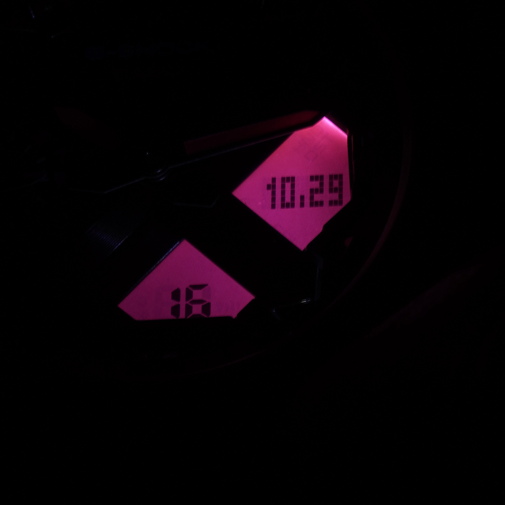 - Podwójny iluminator-Podświetlenie zarówno analogowej jak i cyfrowej tarczy zegarka, kiedy funkcja jest włączona.