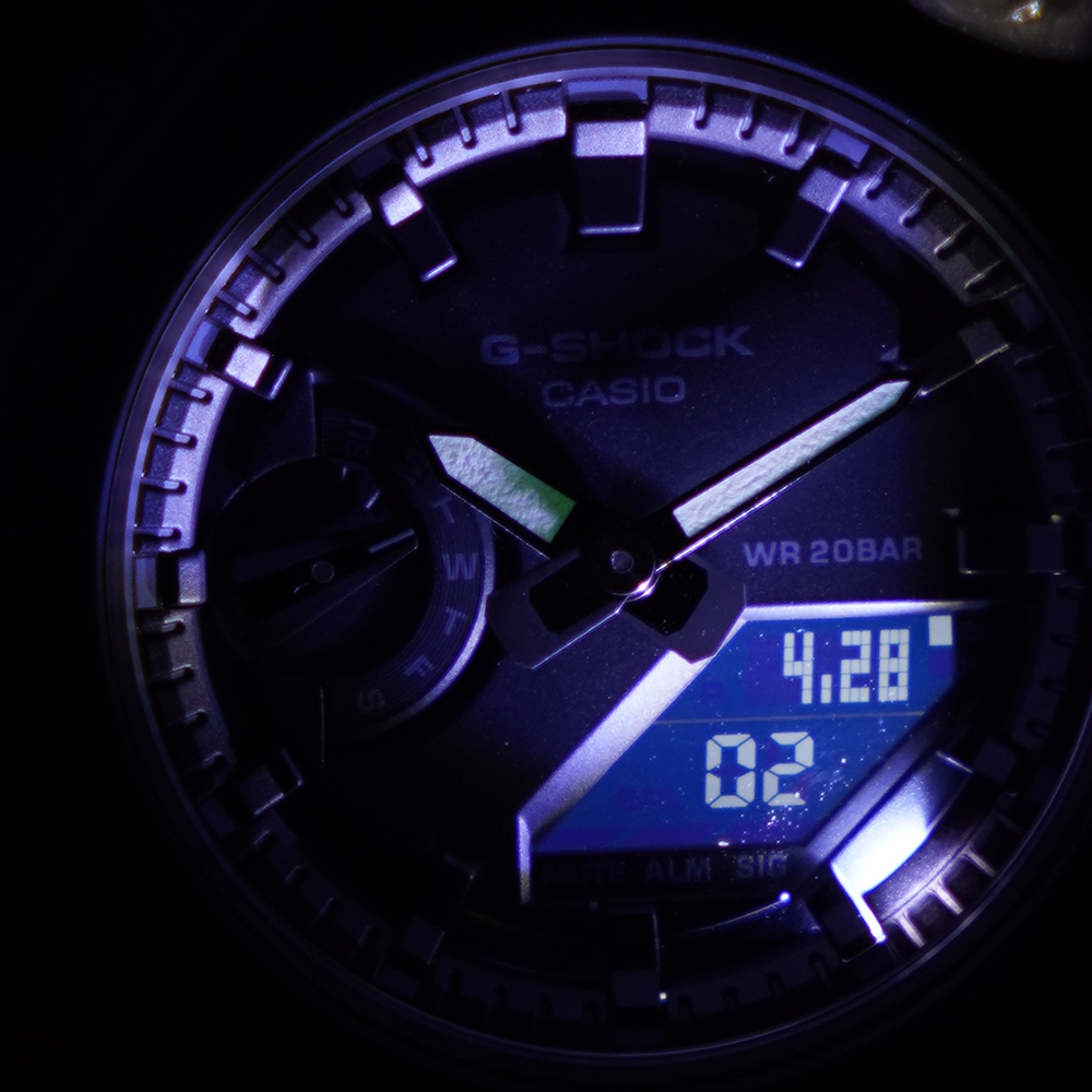 - Podwójny iluminator-Podświetlenie zarówno analogowej jak i cyfrowej tarczy zegarka, kiedy funkcja jest włączona.