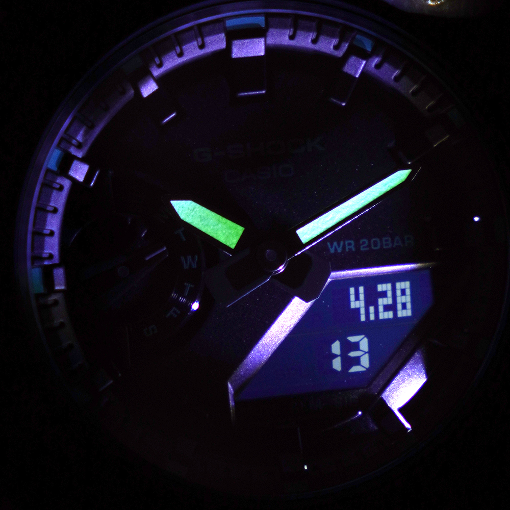 - Podwójny iluminator-Podświetlenie zarówno analogowej jak i cyfrowej tarczy zegarka, kiedy funkcja jest włączona.